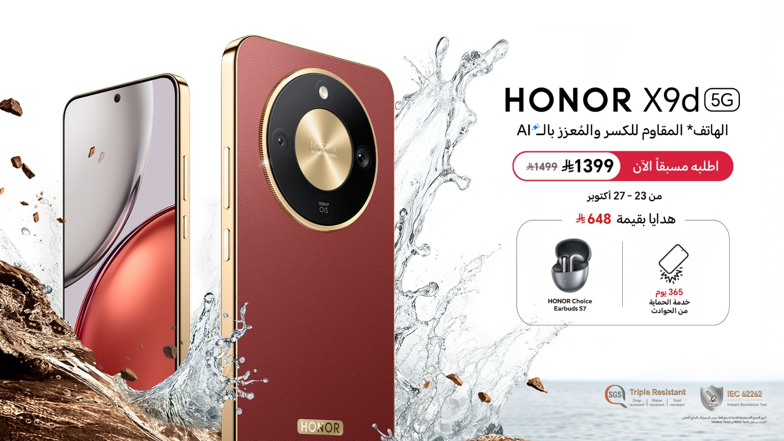 قال جيري لياو، المدير العام لشركة HONOR في السعودية في HONOR الشرق الأوسط وأفريقيا:HONOR X9d 5G” يعكس رؤيتنا لتمكين أسلوب حياة جريء بالتكنولوجيا التي تصمد وتلهم. يجمع الهاتف بين المتانة الفائقة، البطارية المتطورة، والذكاء الحقيقي في تجربة واحدة مصممة لمن يعيش بشغف ويكسر الحدود.”