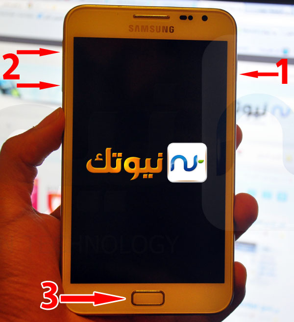 - سنحتاج الآن للدخول لوضع التحميل ( downlod mod ) ويتم ذلك عن طريق الضغط على ( زر التشغيل + زر الهوم + زر خفض الصوت ) تابع الصورة التالية لتعرف أماكن الأزرار .