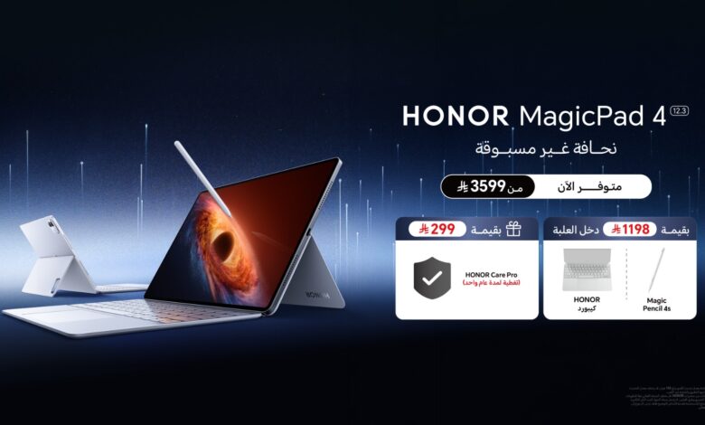 يتوفر جهاز HONOR MagicPad4 باللونين الرمادي والأبيض. يبدأ البيع المُباشر غداً 30 أبريل 2026 في قنوات البيع السعودية، بسعر 3599 ريال سعودي لنسخة 12GB +256GB و3999 لنسخة 16GB +512GB. مع هدايا بقيمة 1497 ريال سعودي عبارة عن لوحة مفاتيح وقلم واشتراك HONOR Care Pro لمدة عام.