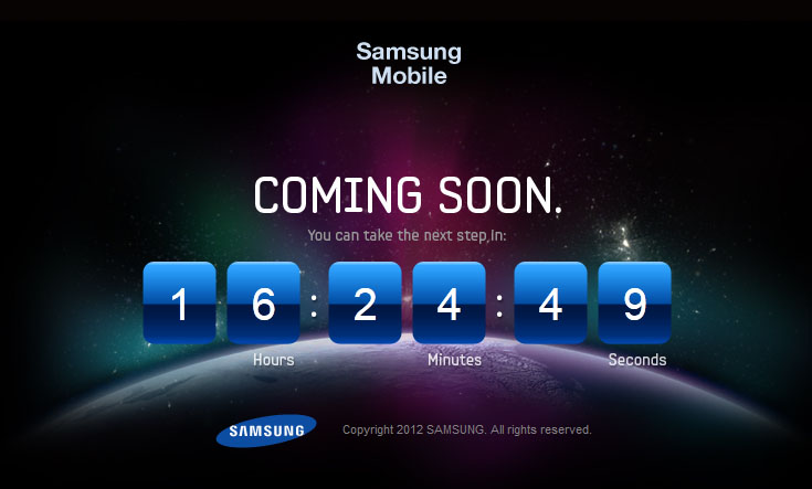 أطلقت سامسونج صفحة جديدة تحتوي على عدادا تنازلي لساعة إلكترونية، بدأ العداد 20 ساعة والآن مضى خمس ساعات و تبقى 16 ساعة تقريباً ، وعبارة في أعلى الصفحة ( Coming Soon ) .