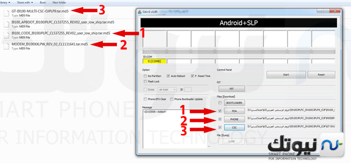 2– ضع الملف الذي باسم ( MODEM_I9100XXLPW_REV_02_CL1131641.tar ) في خانة PHONE في برنامج الأودين .