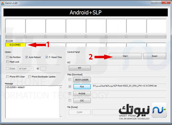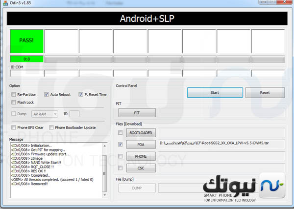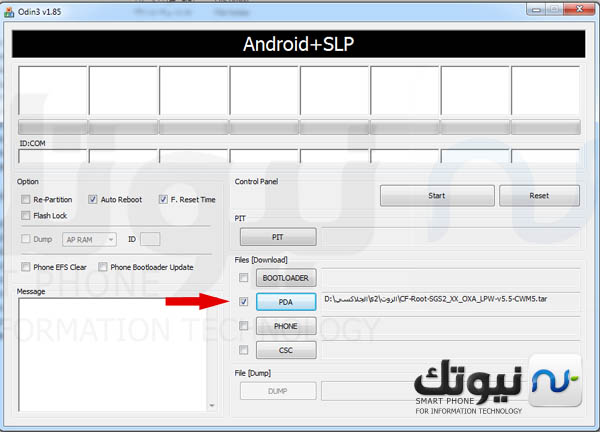 1- ضع الملف الذي باسم ( I9100_CODE_I9100JPLPC_CL537255_REV02_use r_low_ship.tar ) في خانة PDA في برنامج الأودين .