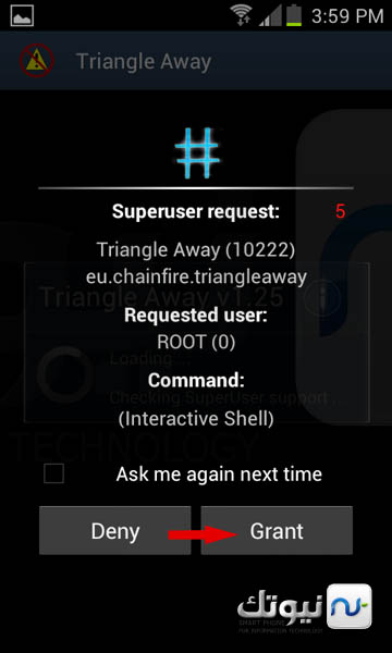 - قم بتشغيل البرنامج وستظهر لك رسالة لمنح صلاحيات الروت للبرنامج كما في الصورة التالية :